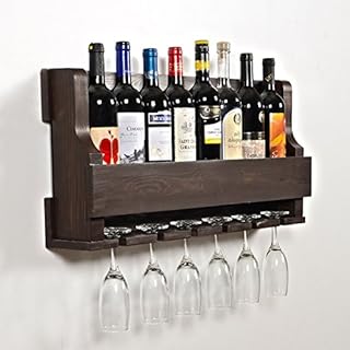 woodymood自然ワインラックグロスホルダー、壁マウントワインラック、8ボトル、Hangers for 6ワイングラス, W : 28.5 ' L : 4 ' H13 ' ブラウン