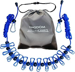 Nasdom 旅行用物干しロープ 4m/13フィート ポータブル 格納式 調節可能 衣類用ロープ 防水バッグ1個付き 洗濯バサミ12個 滑り止めクリップ13個 屋外と屋内用 (ブルー)